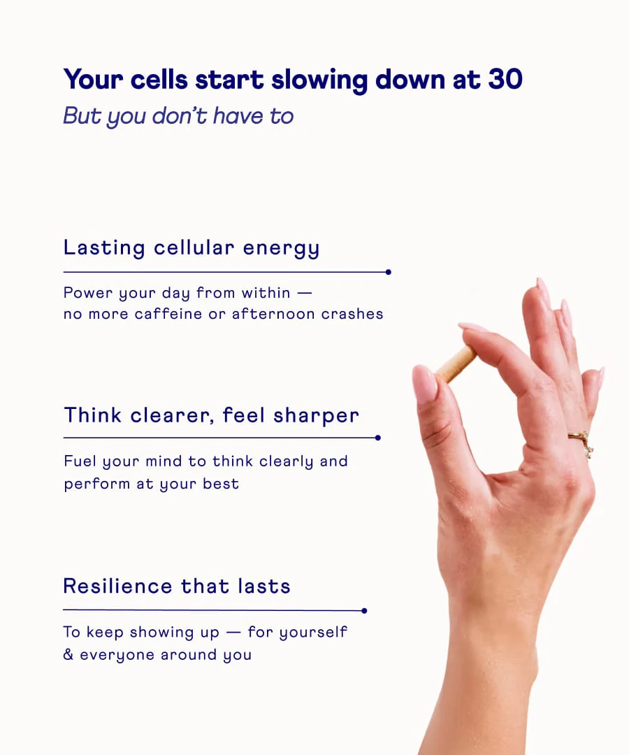 For the first time in the UK, Thrive⁺ brings together 4 powerful ingredients, including NAD⁺ precursor and CoQ10 — backed by 1,000+ scientific studies — to support cellular energy and healthy ageing.